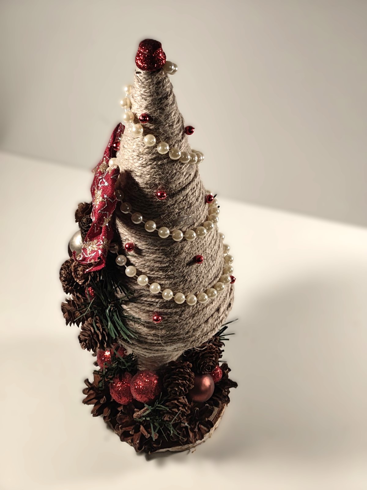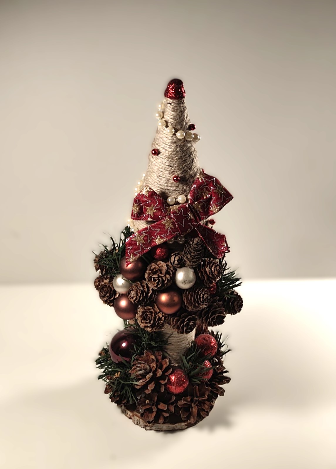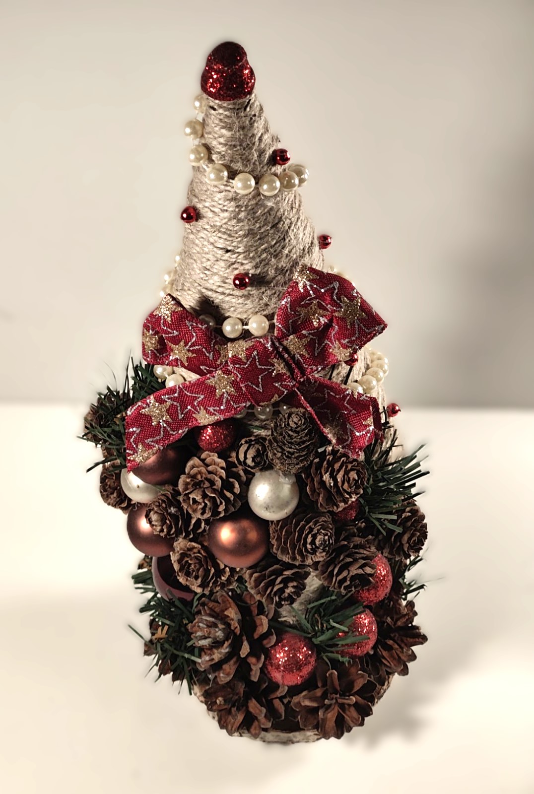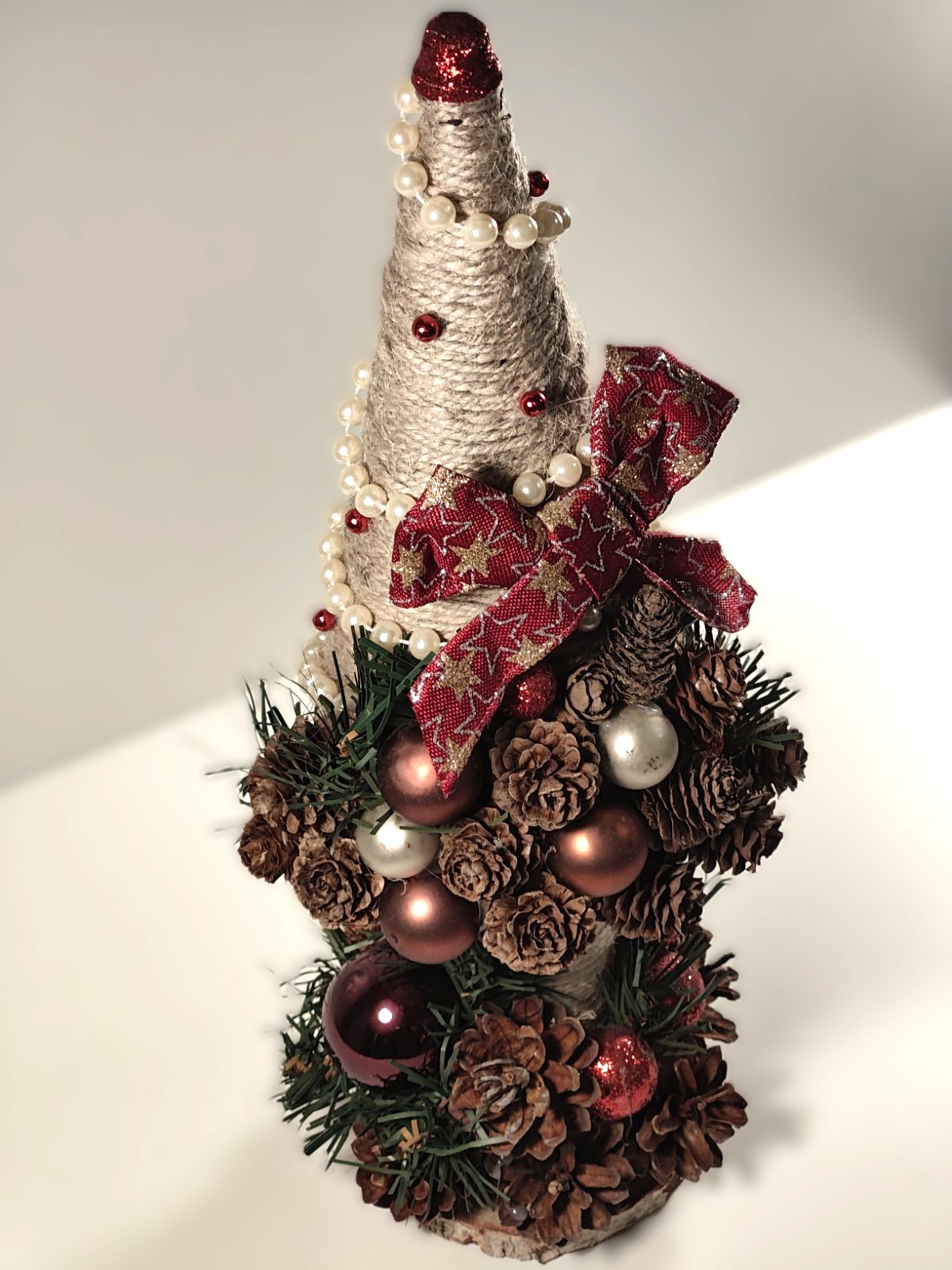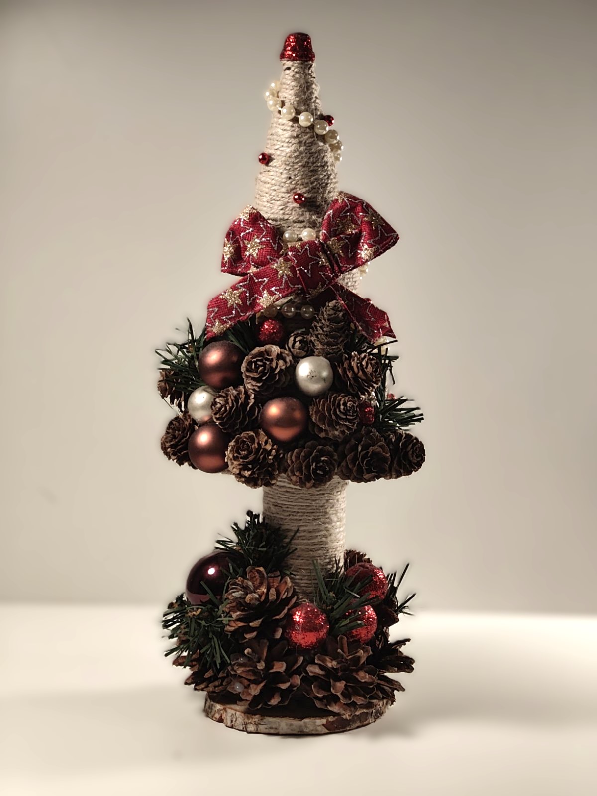 Smukt juletræ (ca. 35 cm. højt) Håndlavet med helt eget design, og helt igennem unikt. Lavede af ægte kogler og dekoreret med små julekugler. På billederne ser de ikke så smukt som i virkeligheden.